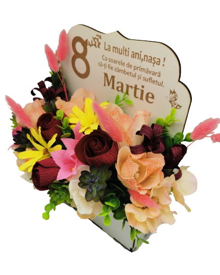 Aranjament floral in cutie de lemn in forma de plic, cu mesaj gravat pentru nasa (8 Martie – La multi ani, nasa! Ca soarele de primavara sa-ti fie zambetul si sufletul!). Aranjamentul contine flori din hartie lucrate manual din hartie floristica si in proportii mici flori din textil, silicon sau plante uscate.