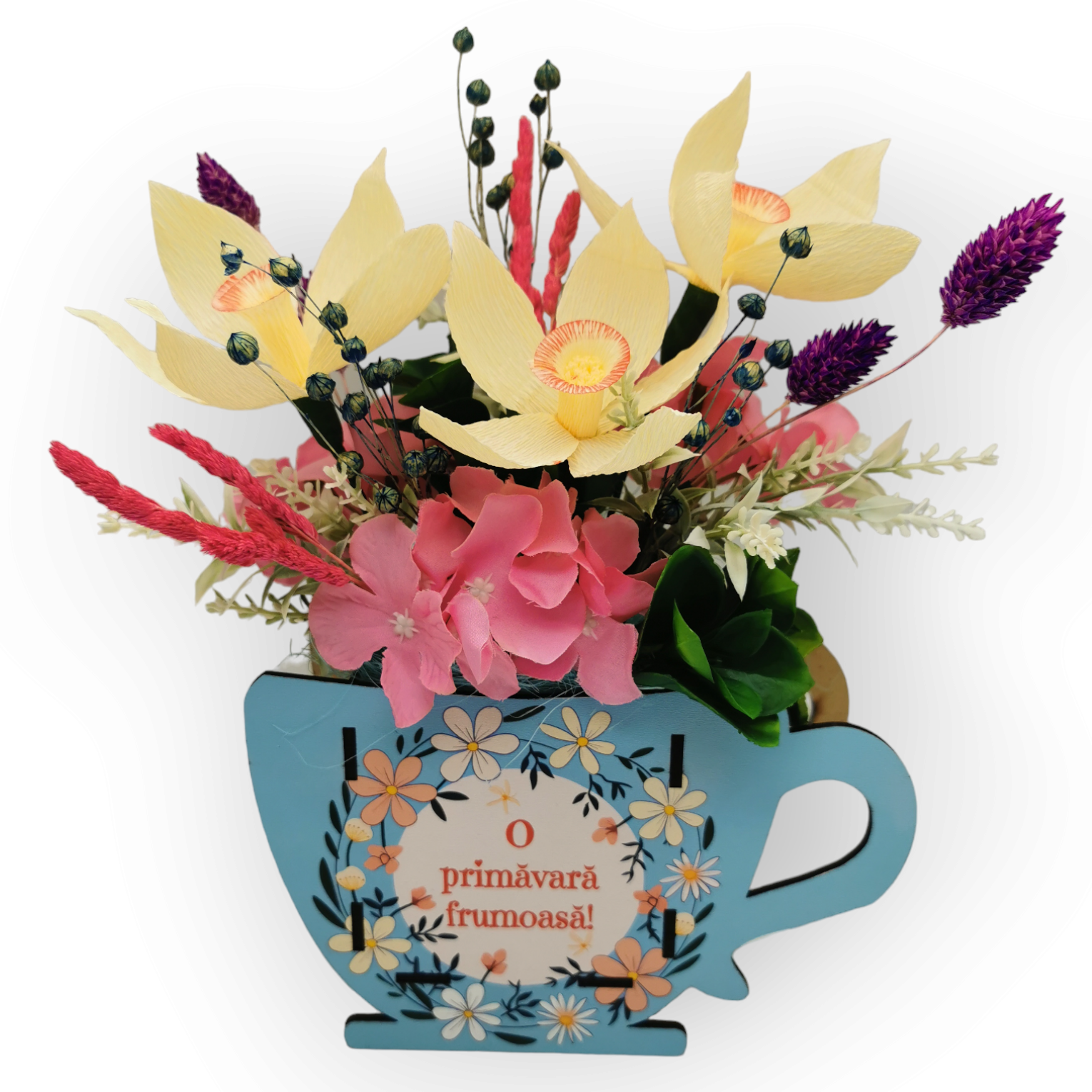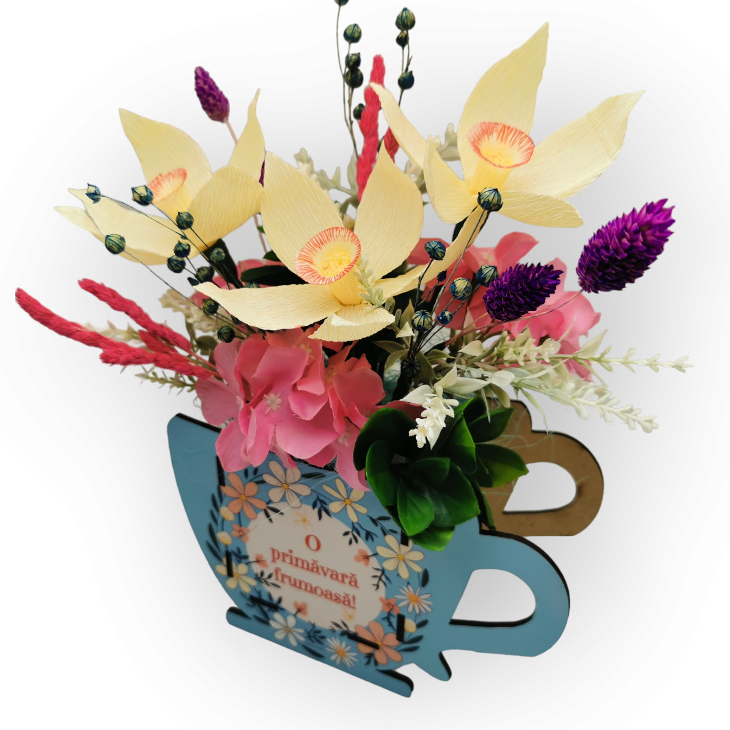 Aranjament floral potrivit pentru o mica atentie cu ocazia zilei de 1 sau 8 Martie realizat din flori de hartie, silicon si plante uscate.