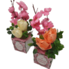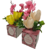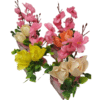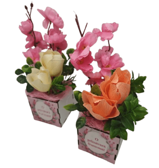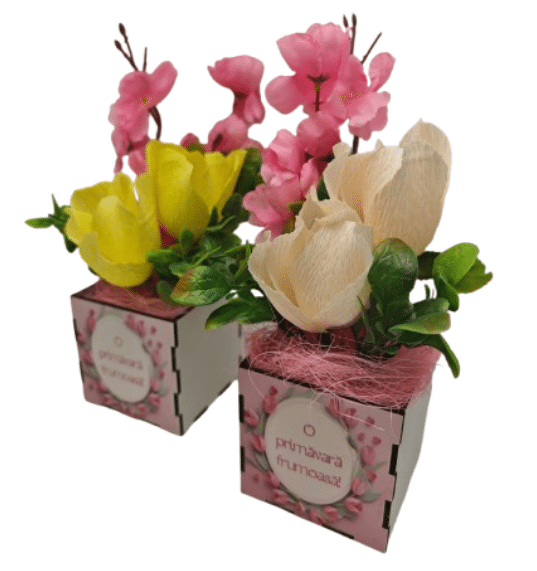 Aranjament floral potrivit pentru o mica atentie cu ocazia zilei de 1 sau 8 Martie realizat din flori de hartie, textil, silicon sau plante uscate.