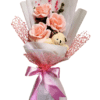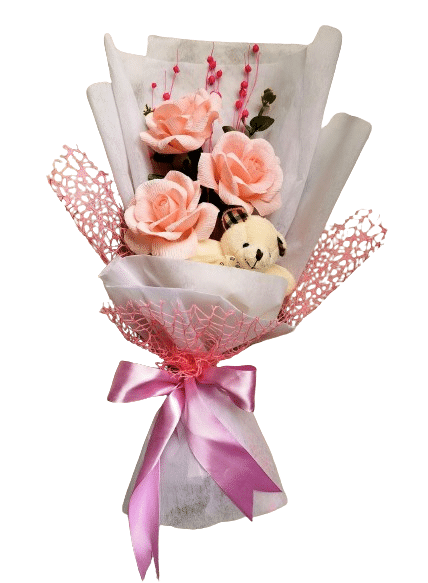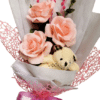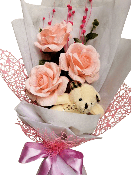 Buchet aniversar cu flori lucrate manual din hartie floristica, accesorizat cu ursulet deplus. Buchetul este ambalat fizelina alba si dantela roz.