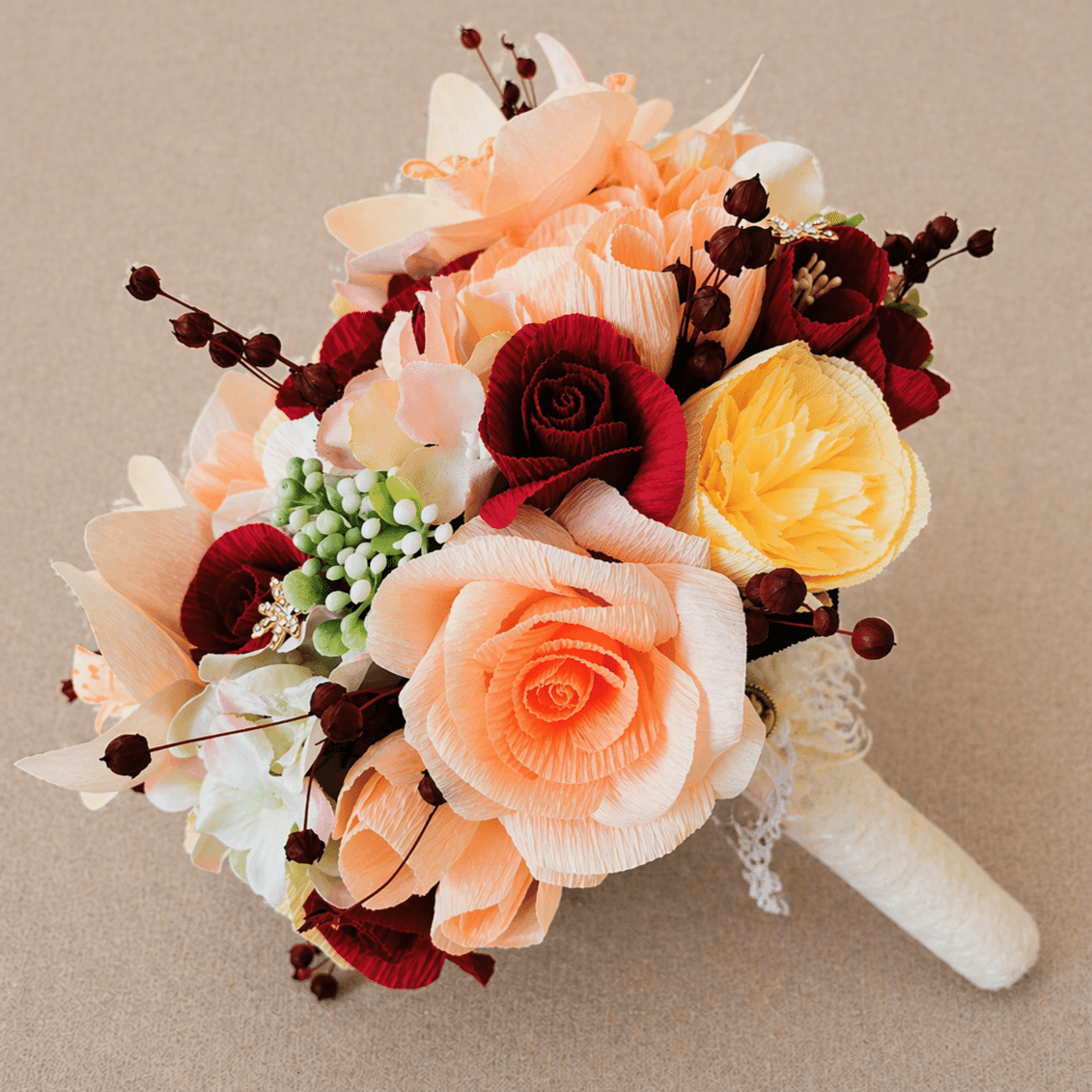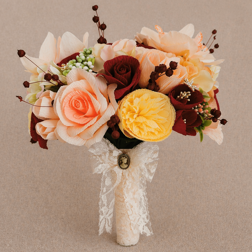 Realizat manual din flori din hârtie, completate cu plante uscate, buchetul îmbină armonios texturile pentru un aspect natural și bogat. Este un buchet care își păstrează frumusețea pe tot parcursul evenimentului și rămâne o amintire specială în timp.