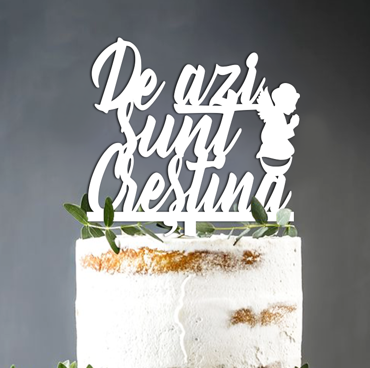 Accesoriul pentru tort are dimensiune aproximativa de 15 x 20 cm cu tot cu bat. Accesoriul se confectioneaza din lemn 4 mm grosime (natur/vopsit dupa caz) sau plexiglas.