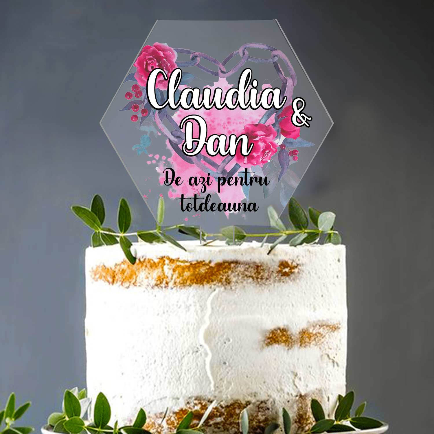 Adaugă un strop de eleganță tortului de nuntă cu un topper personalizat, realizat din materiale premium precum plexiglass, oglindă aurie, oglindă argintie sau lemn vopsit în diverse culori. Fie că îți dorești un topper cu numele mirilor, inițiale, o siluetă romantică de miri sau un model clasic, fiecare piesă este realizată cu atenție la detalii și poate fi configurată exact așa cum îți dorești.