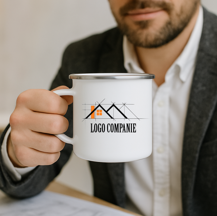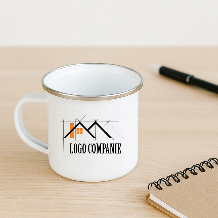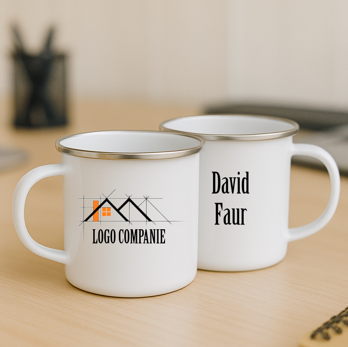 ☕ Cană metalica emailata de 360 ml, personalizată cu logo pe fata si nume pe verso. Ideală pentru companii, evenimente corporate și domeniul HoReCa.