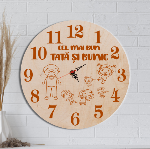 Stilat si versatil, acest ceas personalizat este perfect pentru orice incapere, devenind piesa centrala si un cadou minunat pentru orice ocazie. Ceasul de perete este realizat din placaj lemn, 4 mm grosime. Textul pentru personalizare se graveaza pe suprafata ceasului.