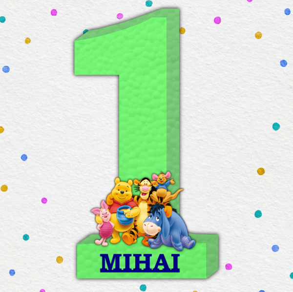 Cifre aniversare Winnie the Pooh and Friends din polistiren 15 cm grosime, vopsit manual, personalizate cu nume si print aplicat – tematica Winnie the Pooh and Friends.