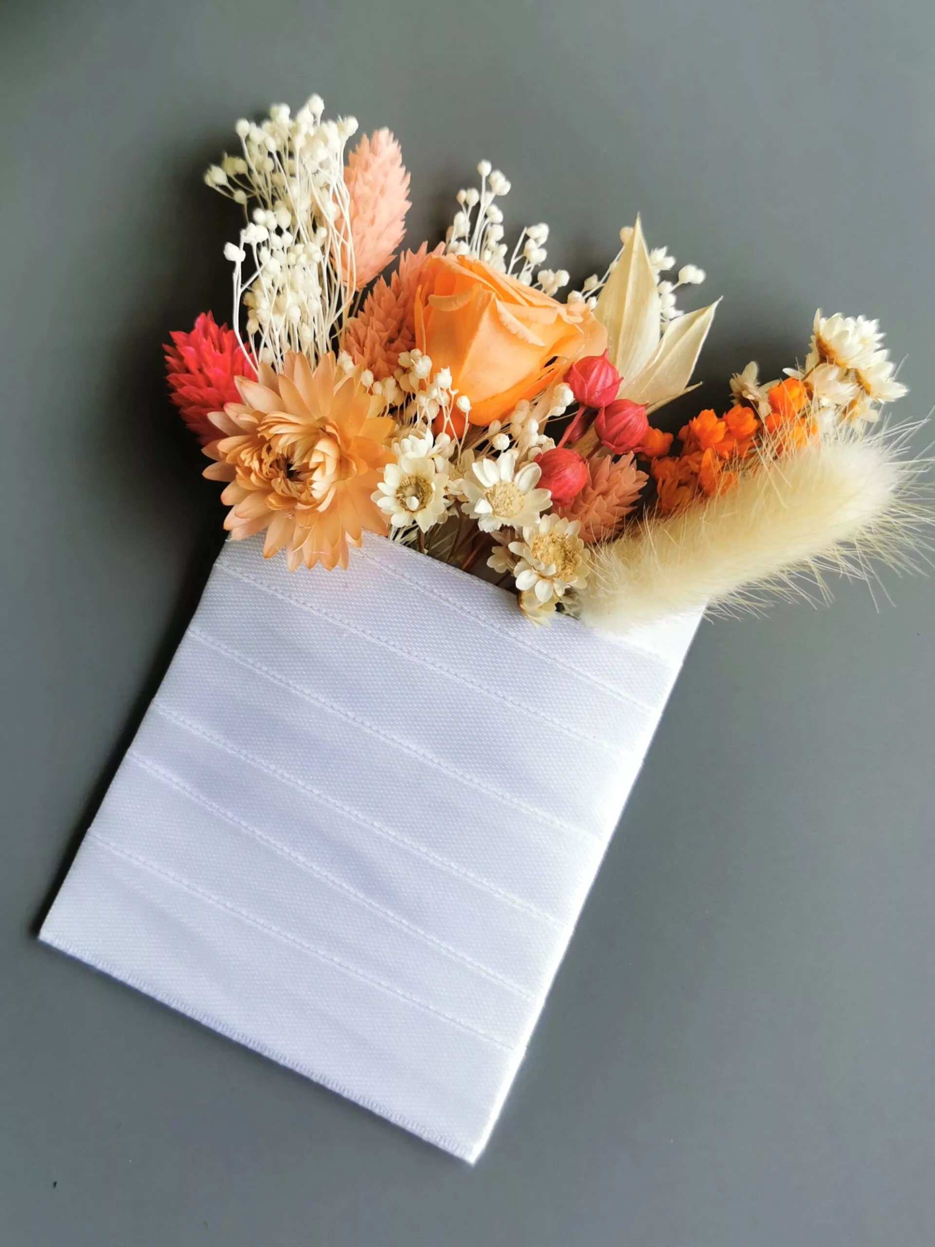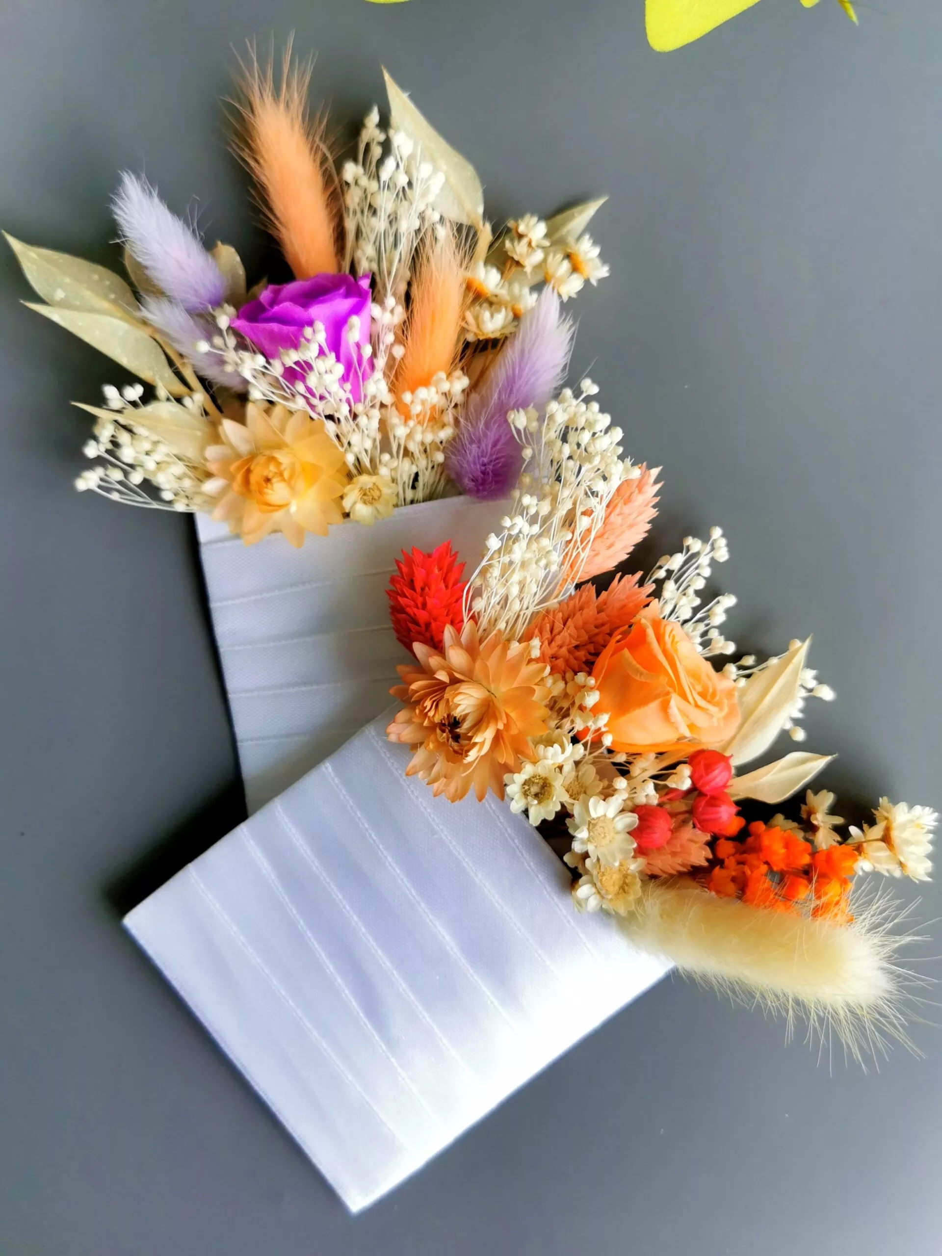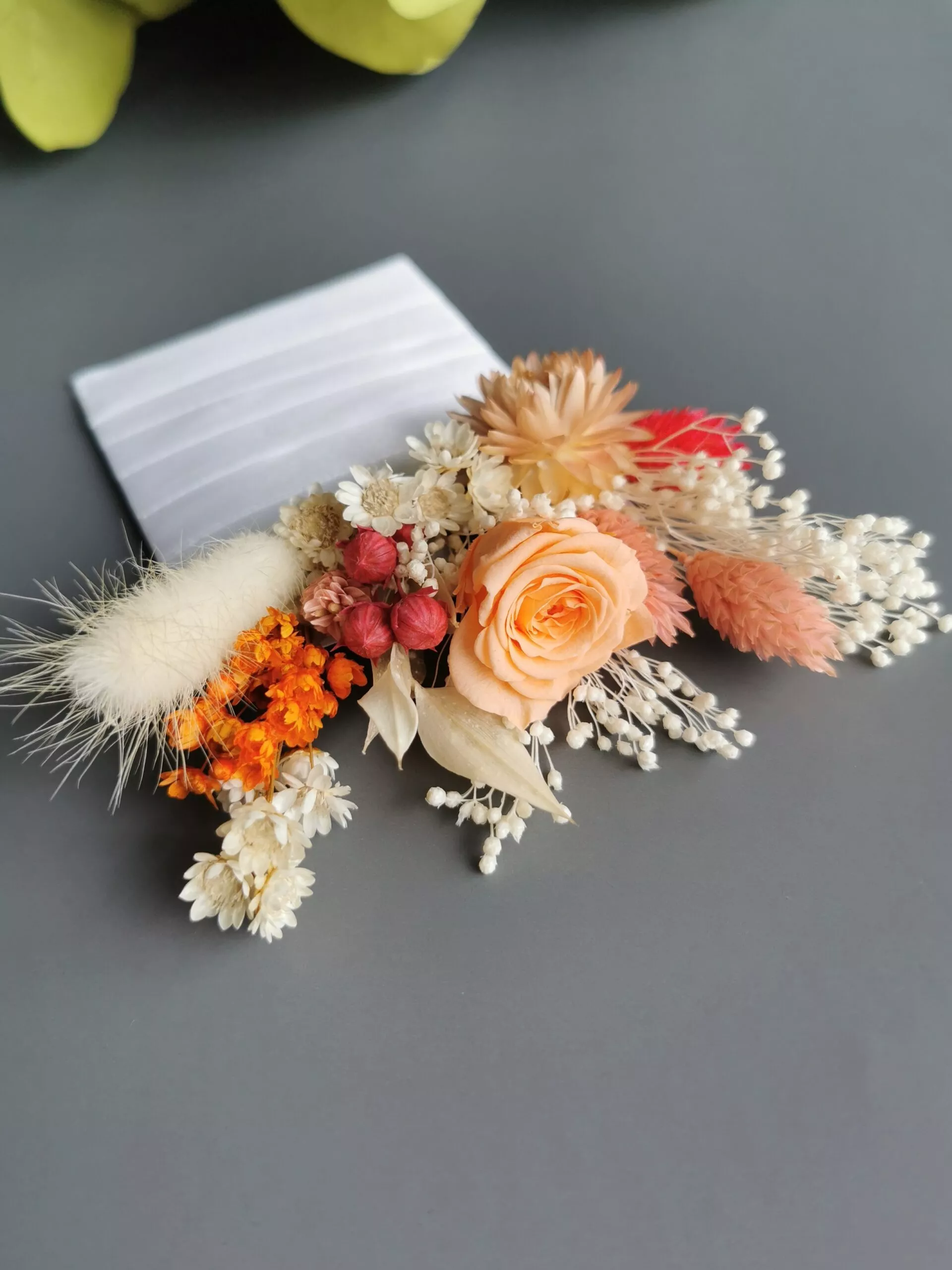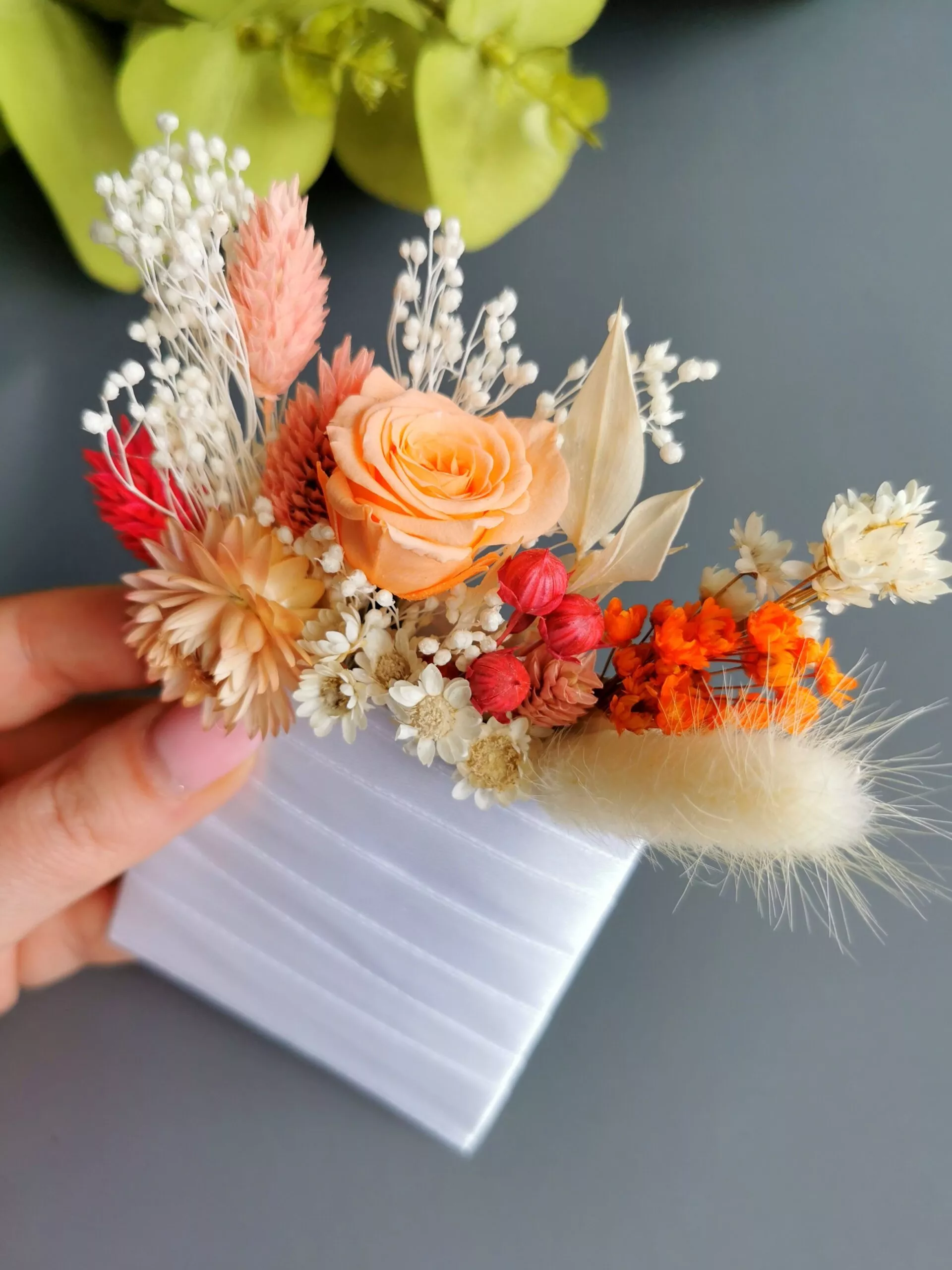 Cocarda/ Butoniera nunta din trandafir criogenat (miniroza) si plante/ flori naturale stabilizate, realizate special pentru a completa tinuta eleganta a invitatilor de la nunta.