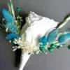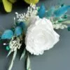 Cocarda nunta din trandafir criogenat XL (5-6 cm diametru) si plante/ flori naturale stabilizate, realizate special pentru a completa tinuta eleganta a invitatilor de la nunta.
