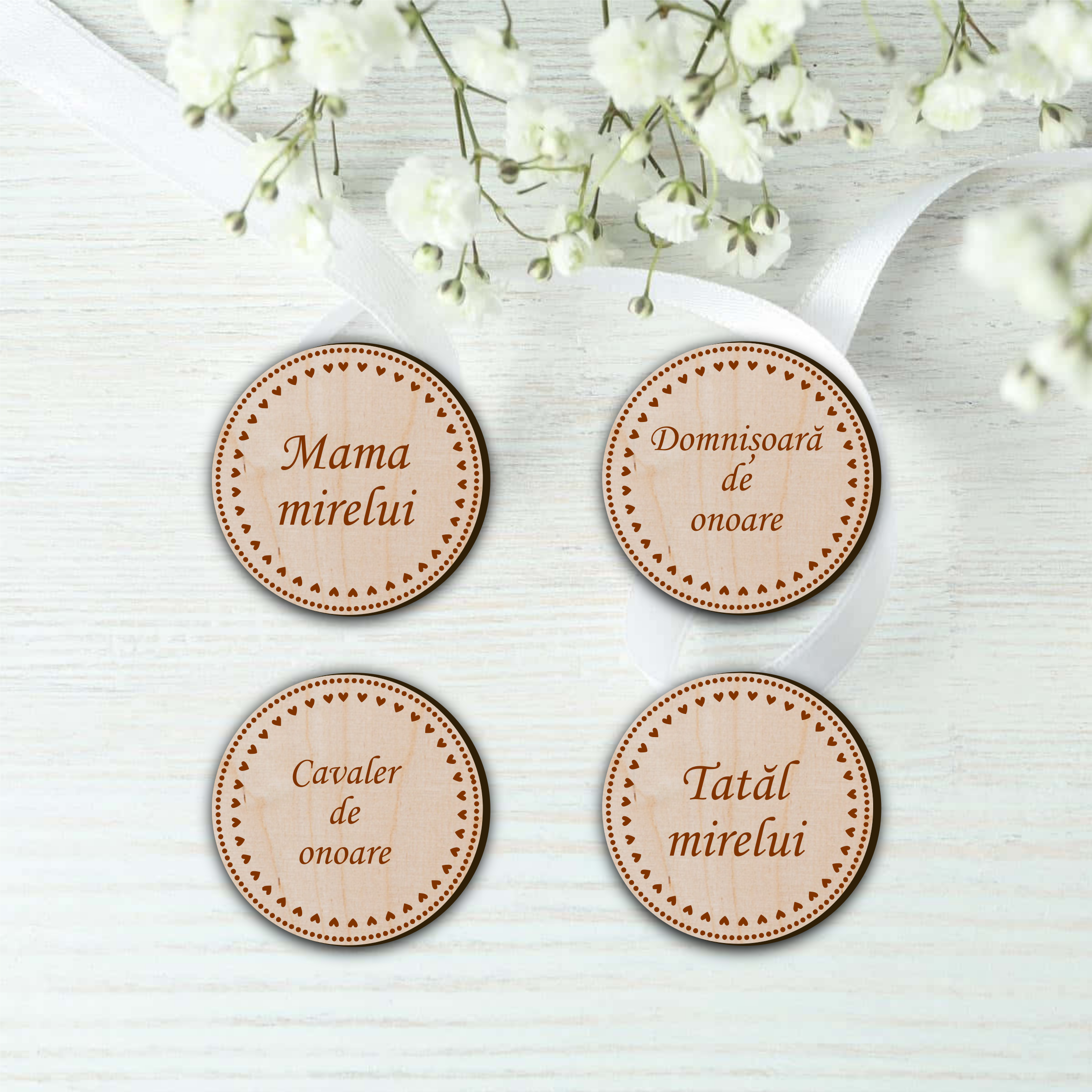 Cocarde personalizate din lemn pentru invitati, perfecte pentru a completa nunta ta de poveste.