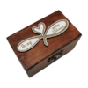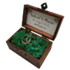 Cutia pentru verighete este realizata din lemn si se personalizeaza prin gravura pe capac (Semnul infinit cu mesajul De astazi pentru totdeauna) si in interior cu prenumele mirilor si/sau dupa caz cu data nuntii. Interiorul cutiei este decorat cu licheni stabilizati de culoare verde.