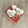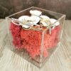 Cutia pentru verighete este realizata din acril transparent cu capac detasabil. Interiorul cutiei este decorat cu licheni stabilizati in nuante de roz si trandafir criogenat de culoare alba. Inimioarele se personalizeaza cu prenumele mirilor si/sau dupa caz data nuntii.
