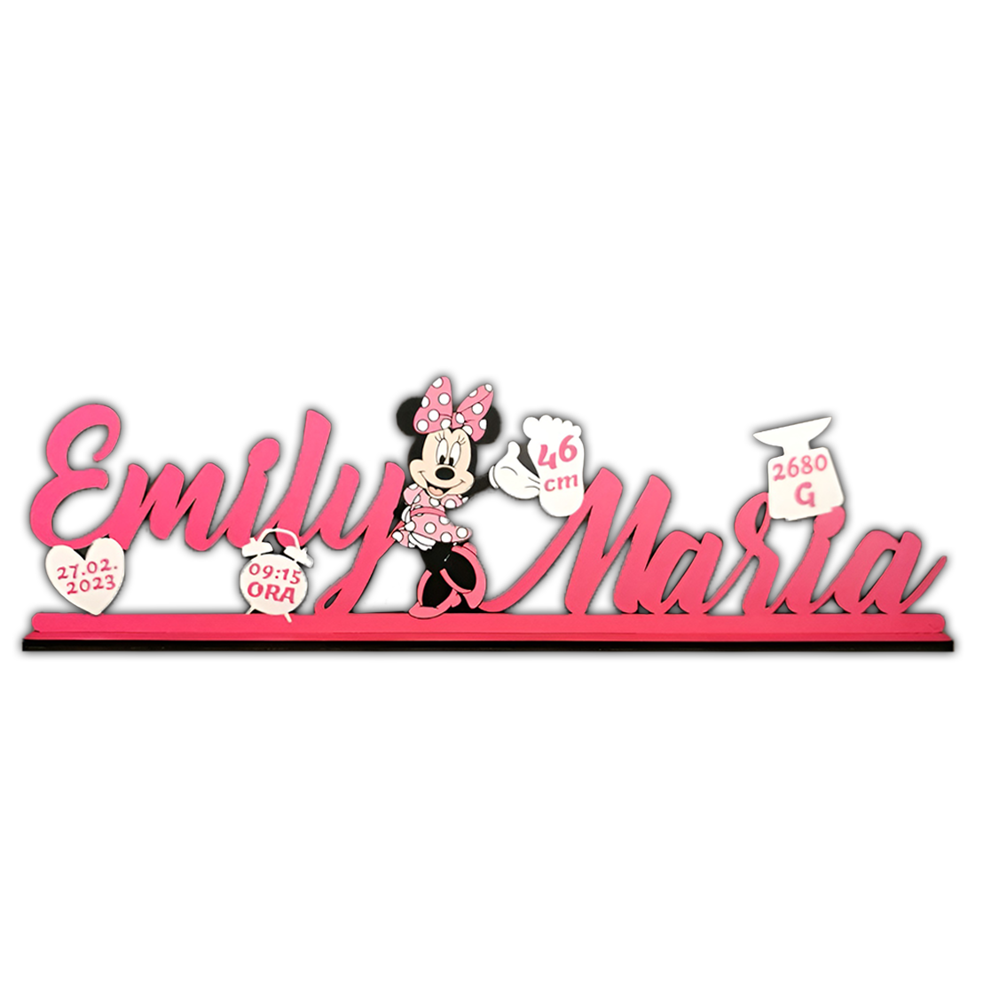 Decoratiune personalizata cu nume si datele de nastere ale copilului, ideala pentru a accesoriza camera micutului dvs – tematica Minnie Mouse