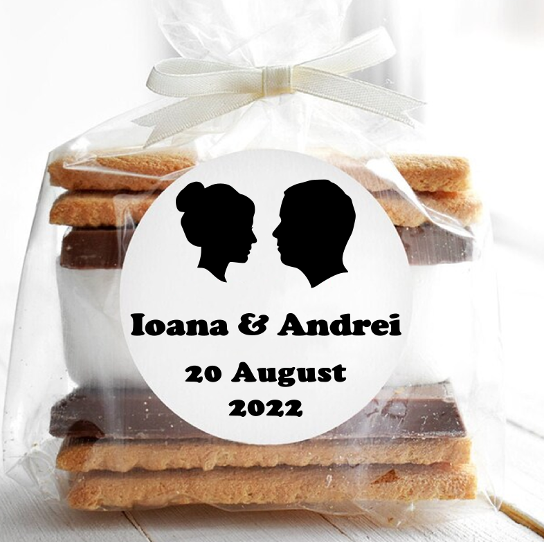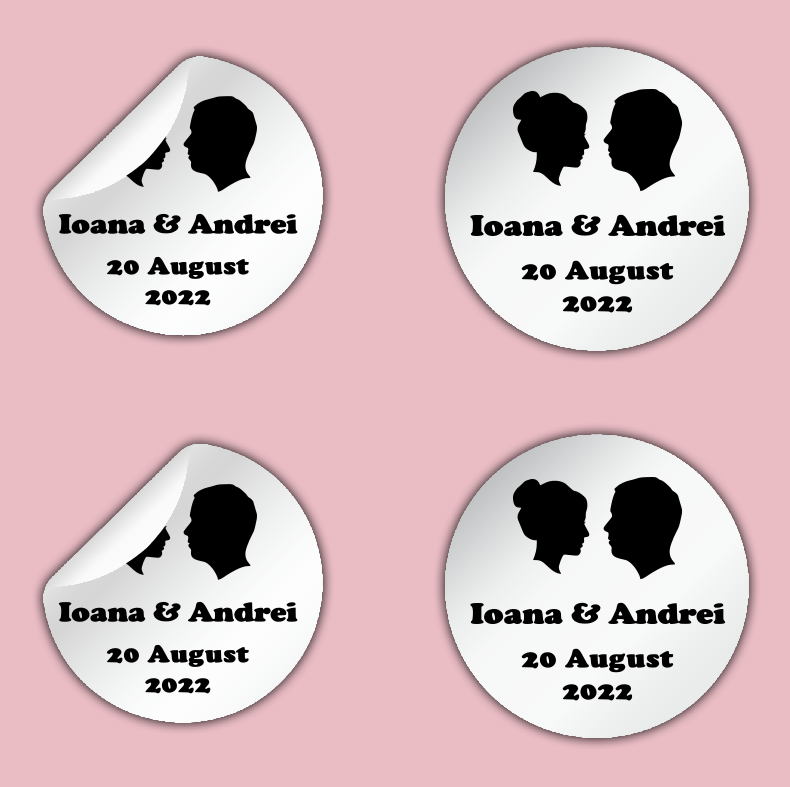 Etichete autoadezive pentru nunta, personalizate cu prenumele mirilor si data nuntii. Etichetele sunt ideale pentru marturii, servetele, naproane, etc.