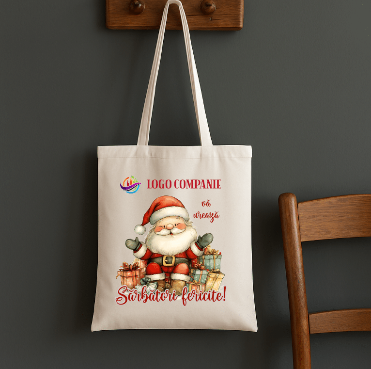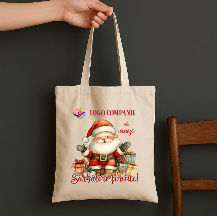 Geantă tip sacoșă din bumbac natural, reutilizabilă, personalizată cu logo sau text. Dimensiune 38×42 cm, suprafață print A4 / A5 in functie de grafica.