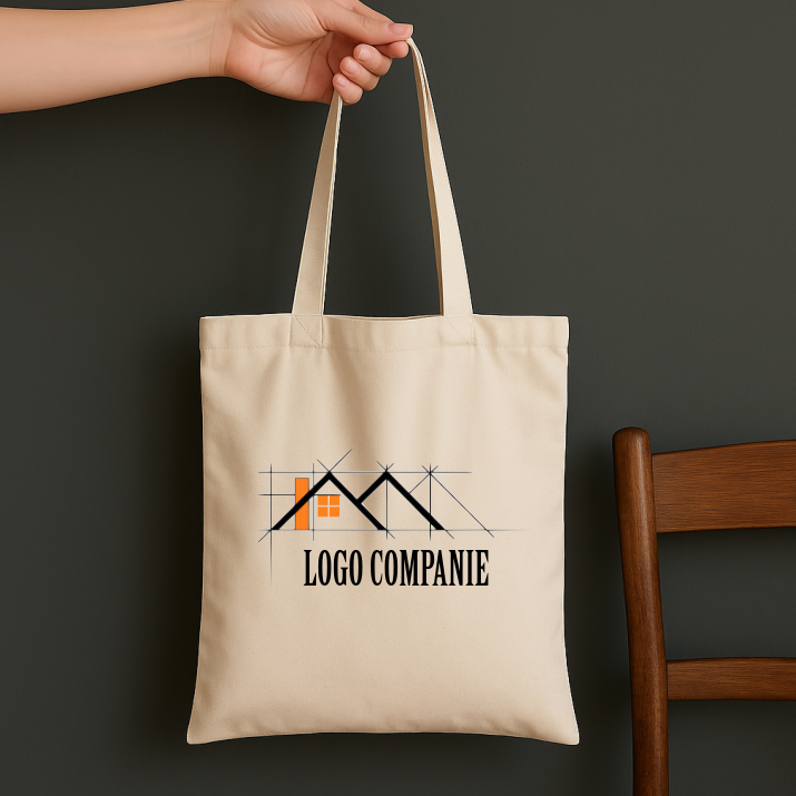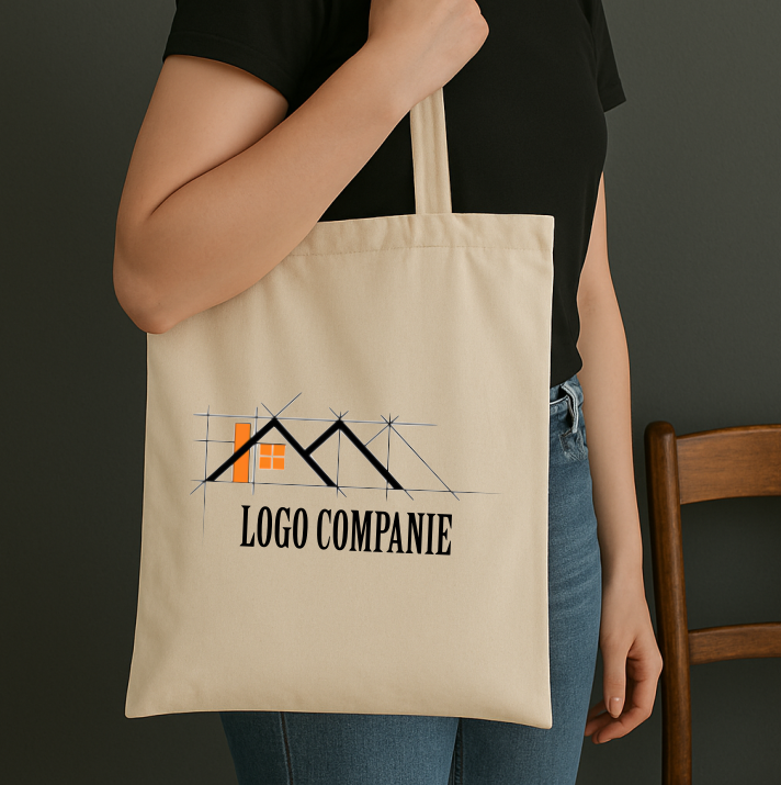 Geantă tip sacoșă din bumbac natural, reutilizabilă, personalizată cu logo sau text. Dimensiune 38×42 cm, suprafață print A4 / A5 in functie de grafica.