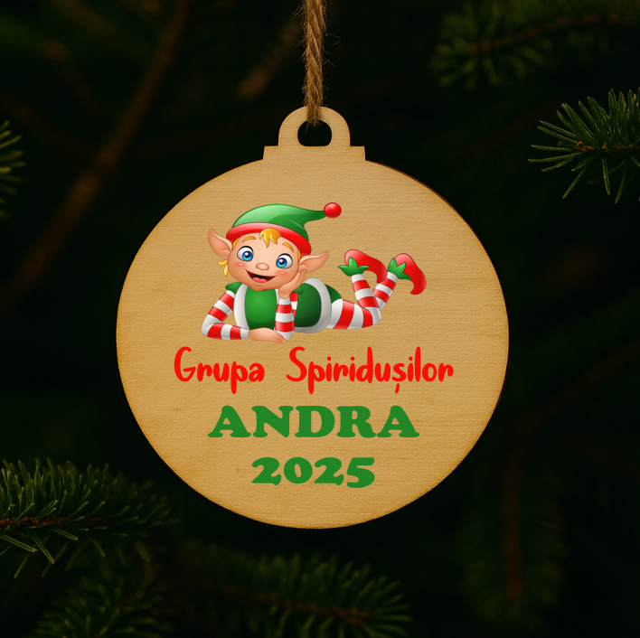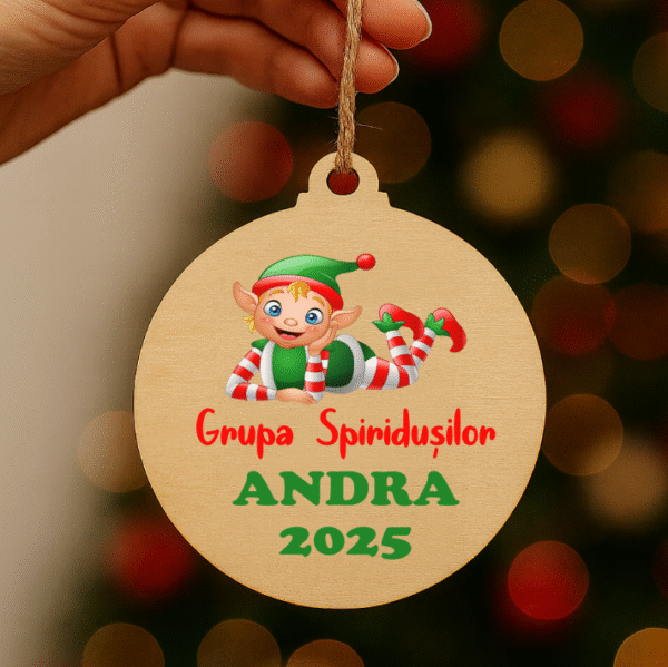 Glob lemn personalizat cu nume confectionat din placaj lemn 4mm grosime, imprimat prin print UV direct pe lemn pe o singura parte. Produsul se livreaza in ambalaj de celofan transparent.
