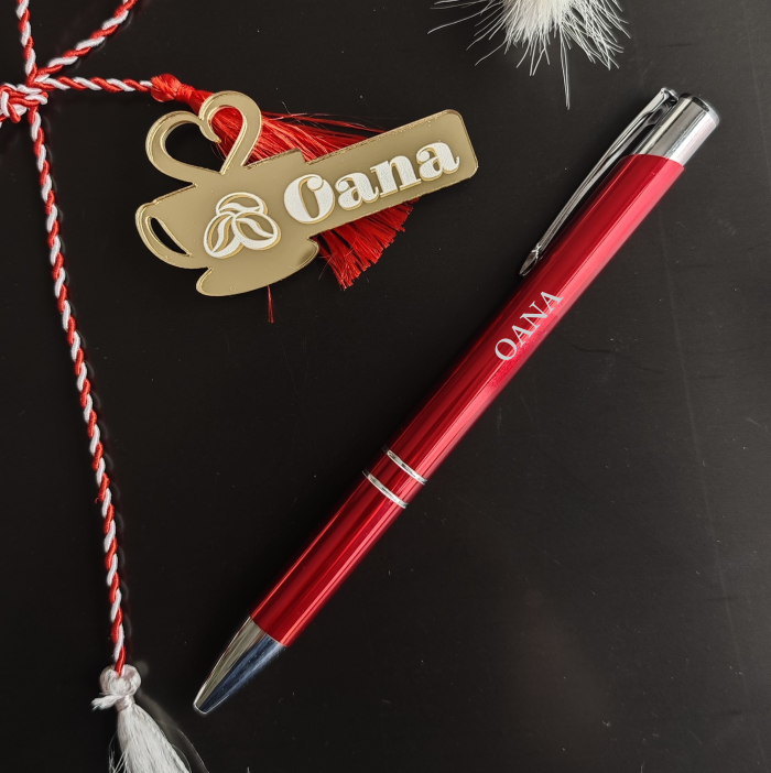 - 🎁 set cadou cu insignă ➕ pix metalic roșu, gravat cu același nume.