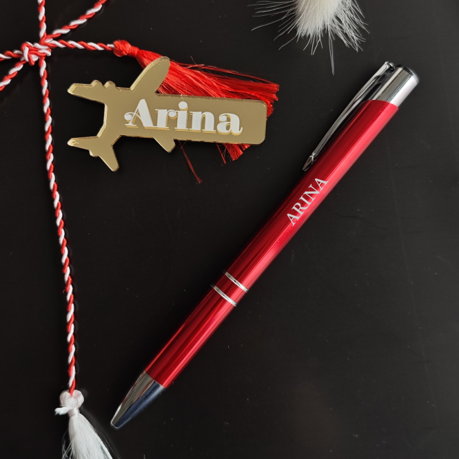 - 🎁 set cadou cu insignă ➕ pix metalic roșu, gravat cu același nume.
