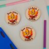 Dimensiune 5 cm diametrul; Agrafa de prindere atasata pe verso; Material HDF alb cu print rezistent UV.