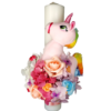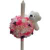 Lumanarea este decorata cu flori de hartie si in proportii mici cu flori din textil, silicon sau plante uscate. Baza lumanarii este decorata cu panglica de saten alba.Jucariile se stabilesc impreuna cu clientul, in functie de stocul disponibil.
