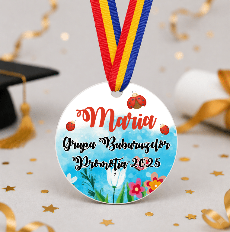 🎓 Fie că este vorba despre grădiniță sau școală, medalia poate fi personalizată cu numele copilului, grupa/clasa și anul promoției, devenind o amintire unică și valoroasă.