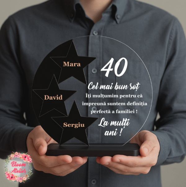 Trofeu aniversar personalizat – cadoul ideal pentru zi de naștere sau aniversare. Elegant, modern și plin de simbolism, acest cadou rafinat surprinde prin designul său unic și devine o amintire de neuitat.