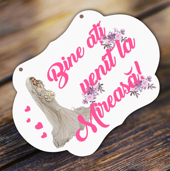 Placuta Bine ati venit la mire reprezinta un accesoriu deosebit pentru nunta destinat nasilor, realizat din placaj de lemn cu print aplicat.