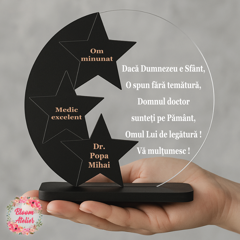 Am făcut acest trofeu surpriză la un medic .Am surprins- o foarte plăcut!!! Nota maximă pentru comunicarea cu dvs !!!!! Voi mai reveni cu alte comenzi !!!