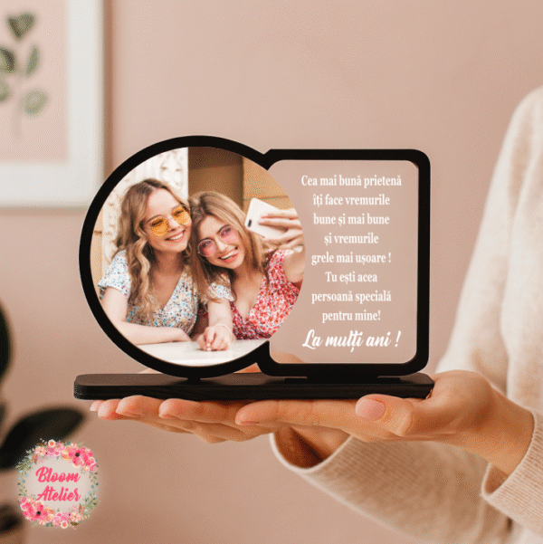 Placuta este realizata din plexiglass 3 mm grosime. Suportul este realizat din lemn (culoare negru) aproximativ 2 cm grosime. Textul se graveaza, iar poza este aplicata pe suprafata materialului.