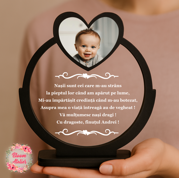 Placuta rotunda personalizata cu poza si text, cadoul perfect pentru nasii de botez ai micutului dvs.