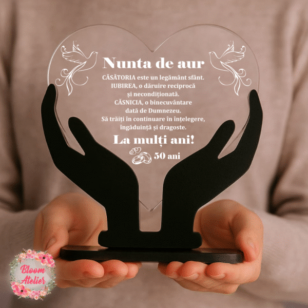 Celebrează iubirea și anii petrecuți împreună cu un trofeu personalizat, simbol al legăturii voastre. Cu un design elegant și mesaj ales de tine, acest trofeu devine o amintire prețioasă a unei povești de dragoste care continuă să inspire.