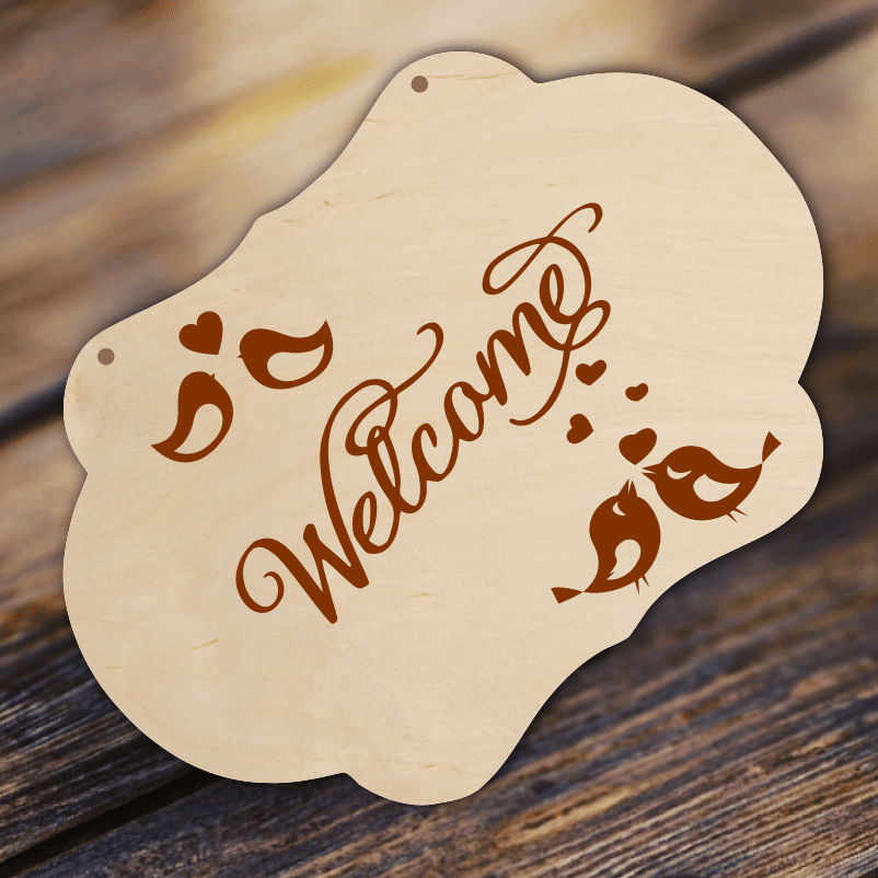 Placuta nunta Welcome/ Bine ati venit, potrivita pentru a le ura bun venit invitatilor la eveniment. Placuta este confectionata din placaj lemn 4 mm grosime. Textul si elementele grafice se graveaza pe suprafata materialului.