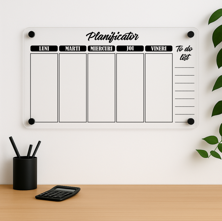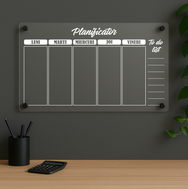 ✍️ Planificator/ Planner Saptamanal Perete potrivit pentru activitatea de birou, administrativa. La cerere, plannerul de perete poate fi personalizat cu logo-ul companiei tale și culorile din identitatea ta vizuală.