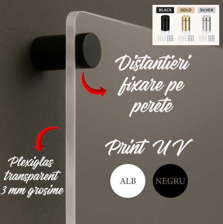 • plexiglas transparent cu print UV (alb sau negru dupa caz);