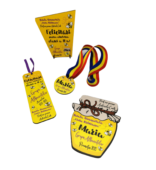 Semn de carte personalizat, un cadou ce se poate oferi in semn de recunostinta absolventilor cu prilejul sfarsitului de an scolar. Semnul de carte este confectionat din placaj MDF cu print color si snur atasat. La cerere, produsul se poate lucra si pe alte tematici.