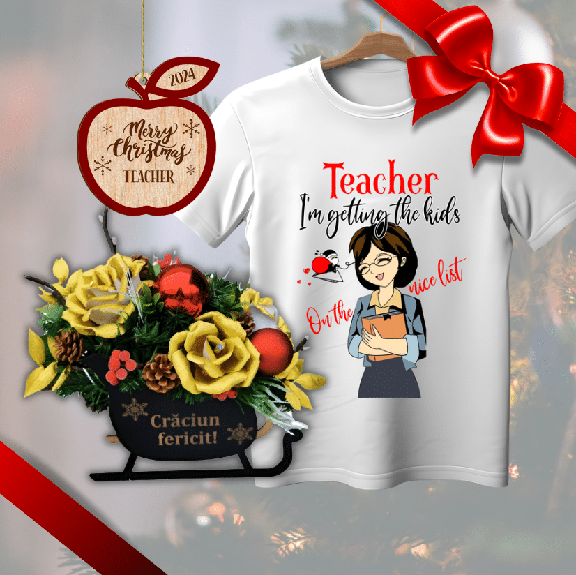 Aranjament Craciun in saniuta cu trandafiri aurii cu flori din hartie, tematica pentru Craciun, in cutie de lemn in forma de saniuta gravata cu mesaj („Craciun fericit!”).