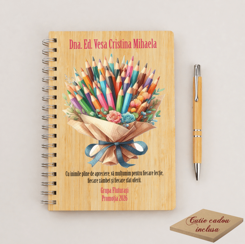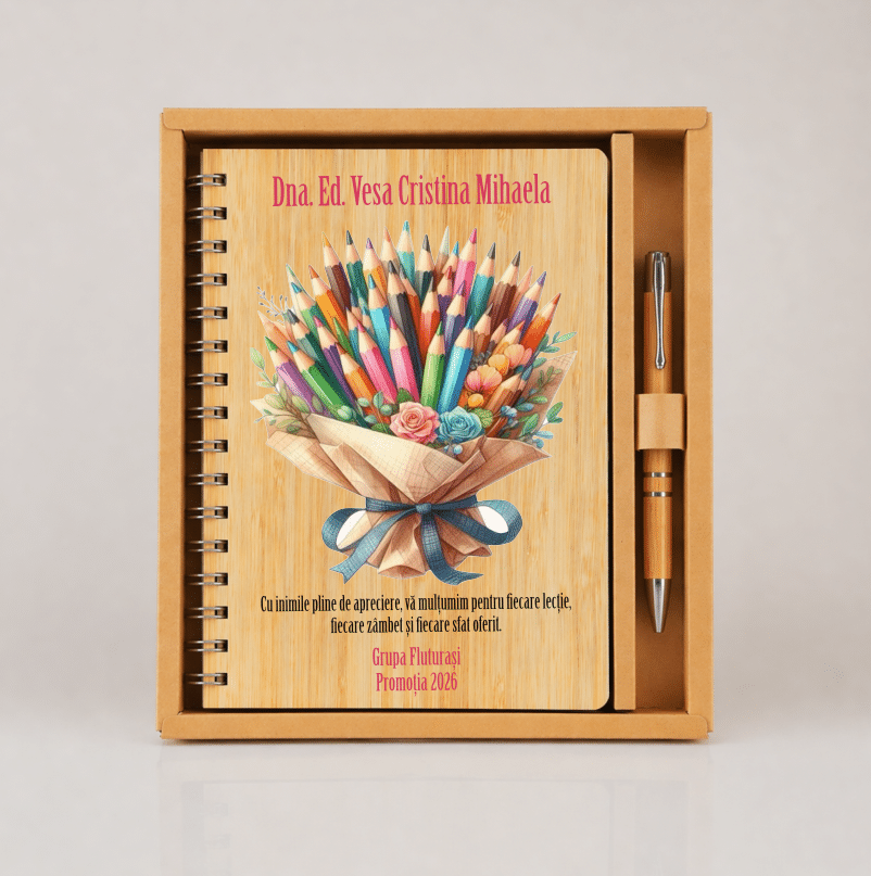Cauți un cadou special pentru educatoare? Alege un set cadou personalizat elegant, cu agendă din bambus și pix asortat, ambalat în cutie cadou – ideal pentru orice ocazie.