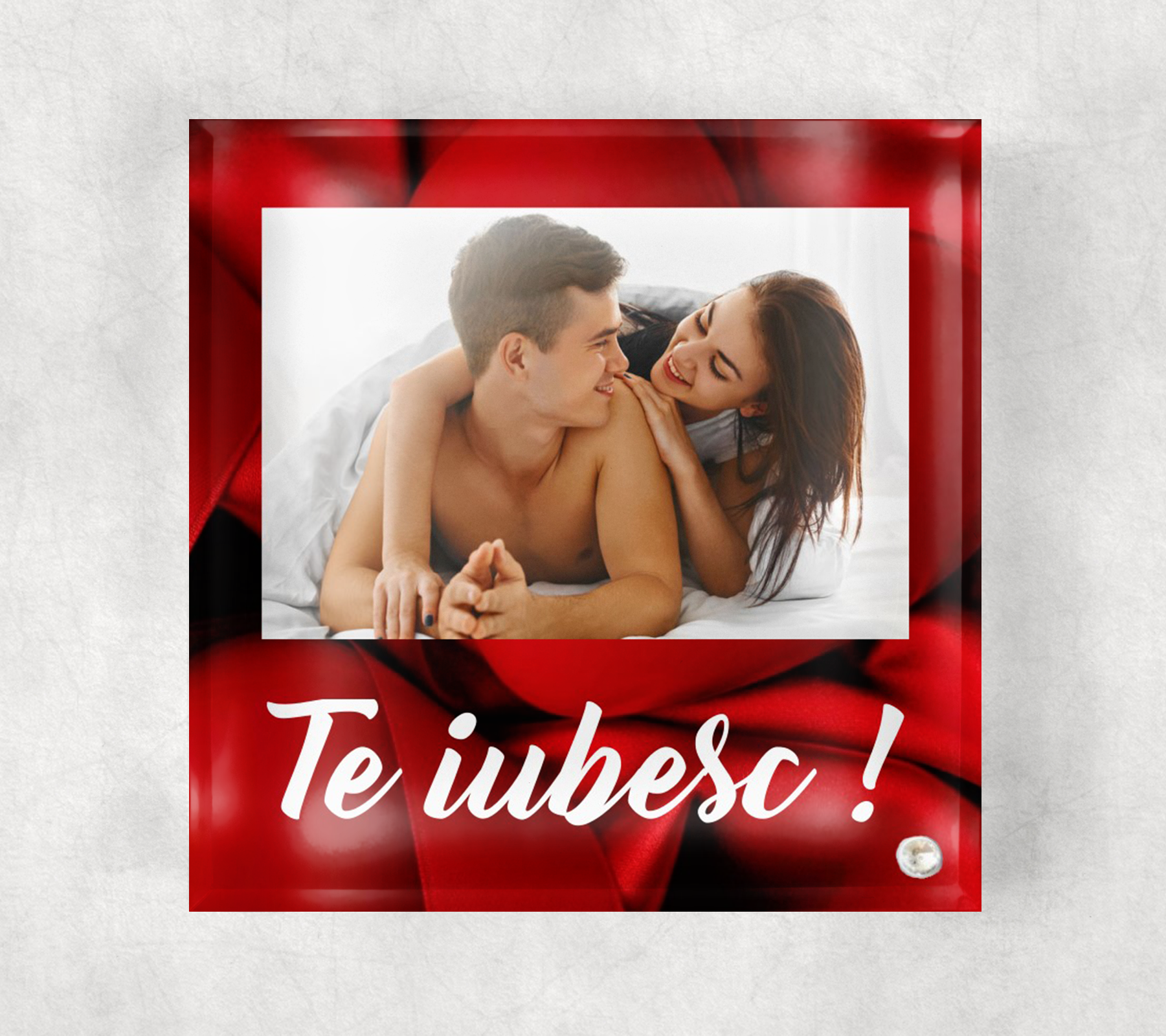 🖼️ Ramă foto din sticlă personalizată cu fotografia aleasă. Dimensiune: 20 x 20 cm. Rama foto include un piciorus pentru fixare in pozitie verticala
