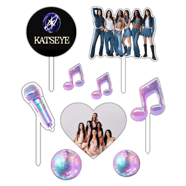Transformă tortul aniversar într-un decor misterios și modern cu figurinele pentru tort Katseye. Aceste toppere sunt perfecte pentru o petrecere cu stil și completează ideal o tematică inspirată din simboluri, fashion sau vibe urban.