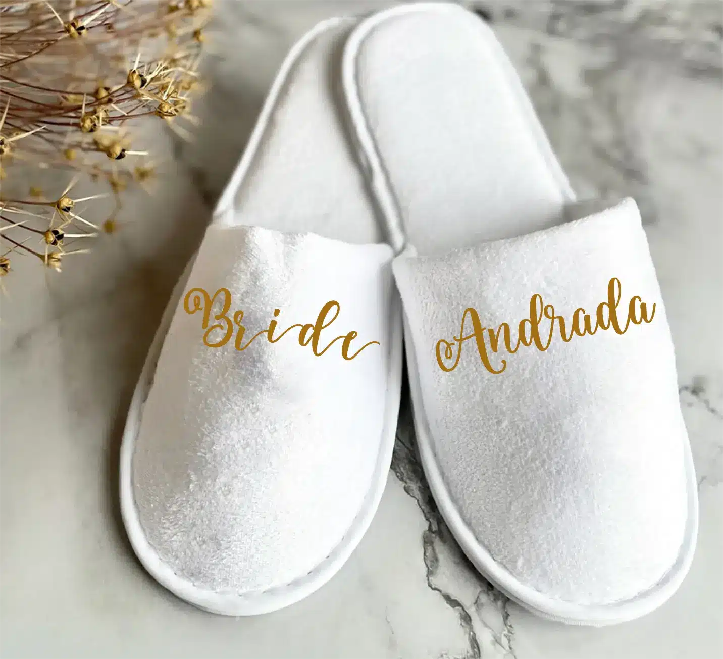 Asortează-ți halatul de mireasă cu o pereche de papuci personalizați pentru a completa ținuta ta specială!