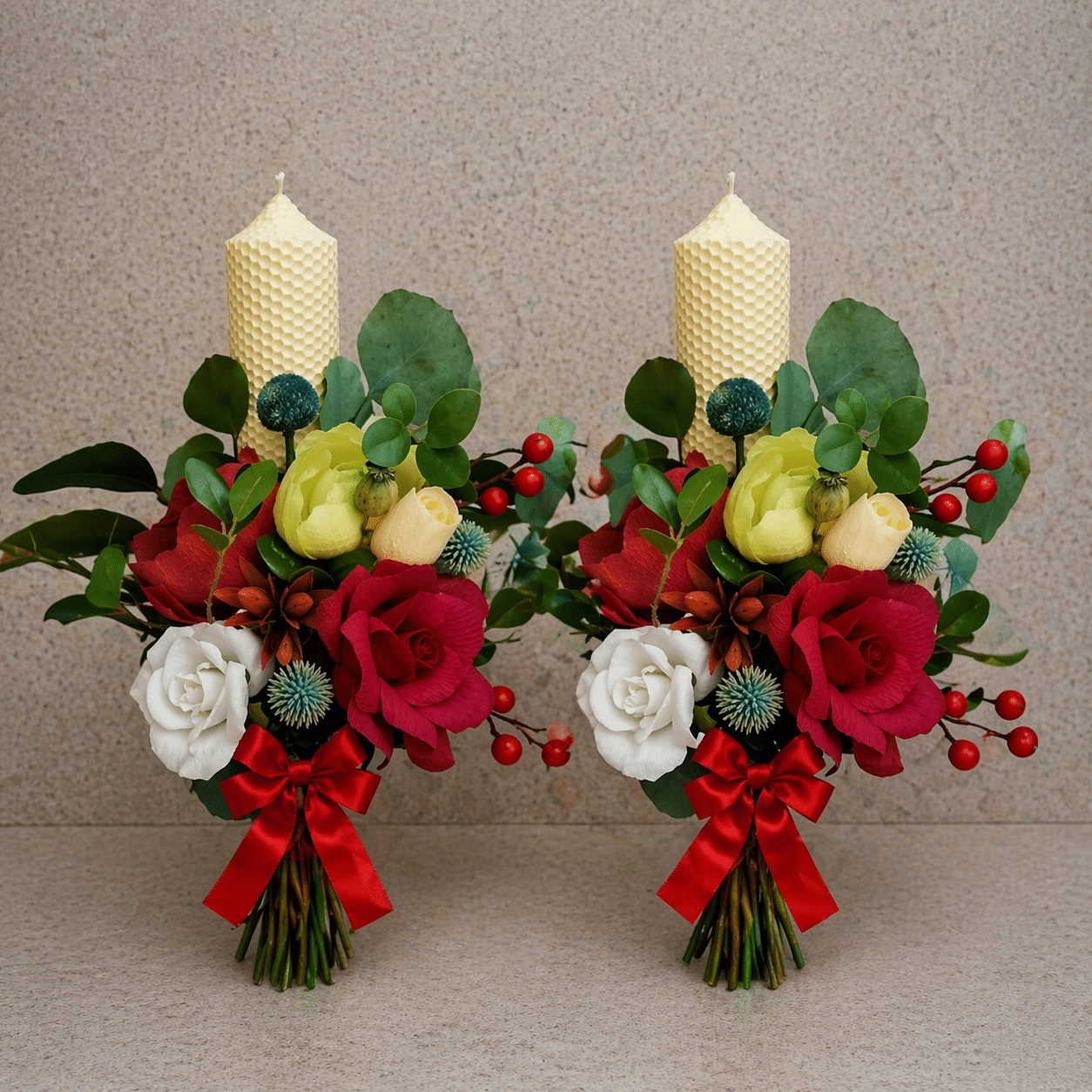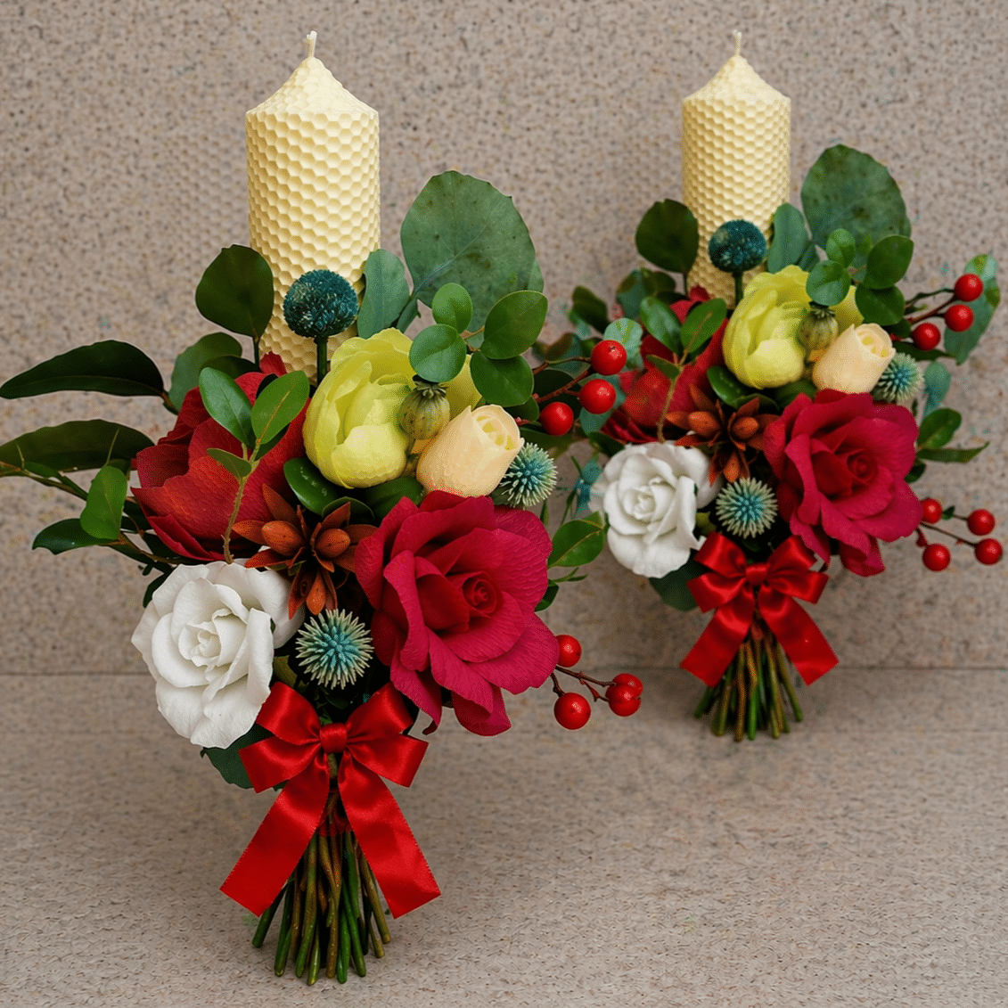 Alege un set de lumânări de nuntă elegante tip fagure, realizate din ceară naturală, perfecte pentru ceremonia de cununie religioasă. Cu un design rafinat și textură specifică fagurelui, aceste lumânări adaugă un plus de stil și naturalețe unuia dintre cele mai importante momente din viața voastră.