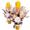 Lumanarile fagure din ceara naturala sunt decorate cu un buchetel din plante naturale uscate si trandafir din hartie floristica si accesorizate la baza cu panglica de saten si funda din dantela.