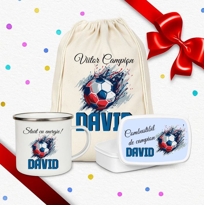 Set Personalizat Copii, Rucsac+Cana metalica+Caserola, Fotbal