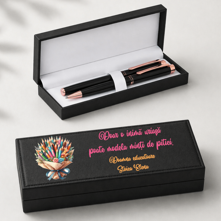 Oferă un cadou premium, util și memorabil unui cadru didactic special! Acest set elegant de scris, format din pix cu mecanism twist și roller pen cu capac, este alegerea ideală pentru profesori, profesoare, diriginți, diriginte, învățătoare sau educatoare.