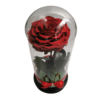 Trandafir criogenat rosu, marimea XXL (aprox. 10 cm diametrul), decorat la baza cu licheni stabilizati de culoare verde, in cupola de sticla accesorizata cu funda. Atentie ! Cupola nu este lipita de suportul de lemn.